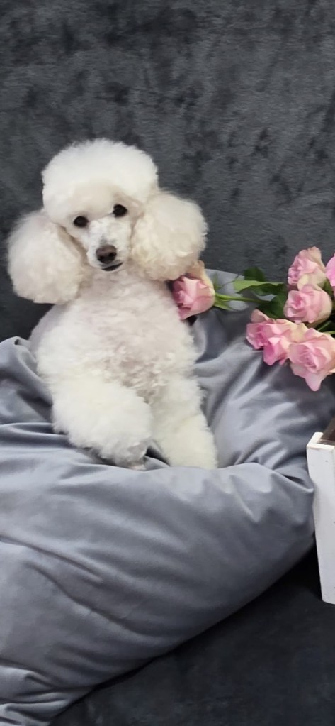 Bald wird mein weißer Toypudelrüde „Wallenberg’s Z-Wacker Wacker“ zuchttauglich geschrieben. Er ist ein Sohn vom sehr erfolgreichen finnischen Toy „Executive League of Gentlemen“ und „Princess Livable Future White Syringa“